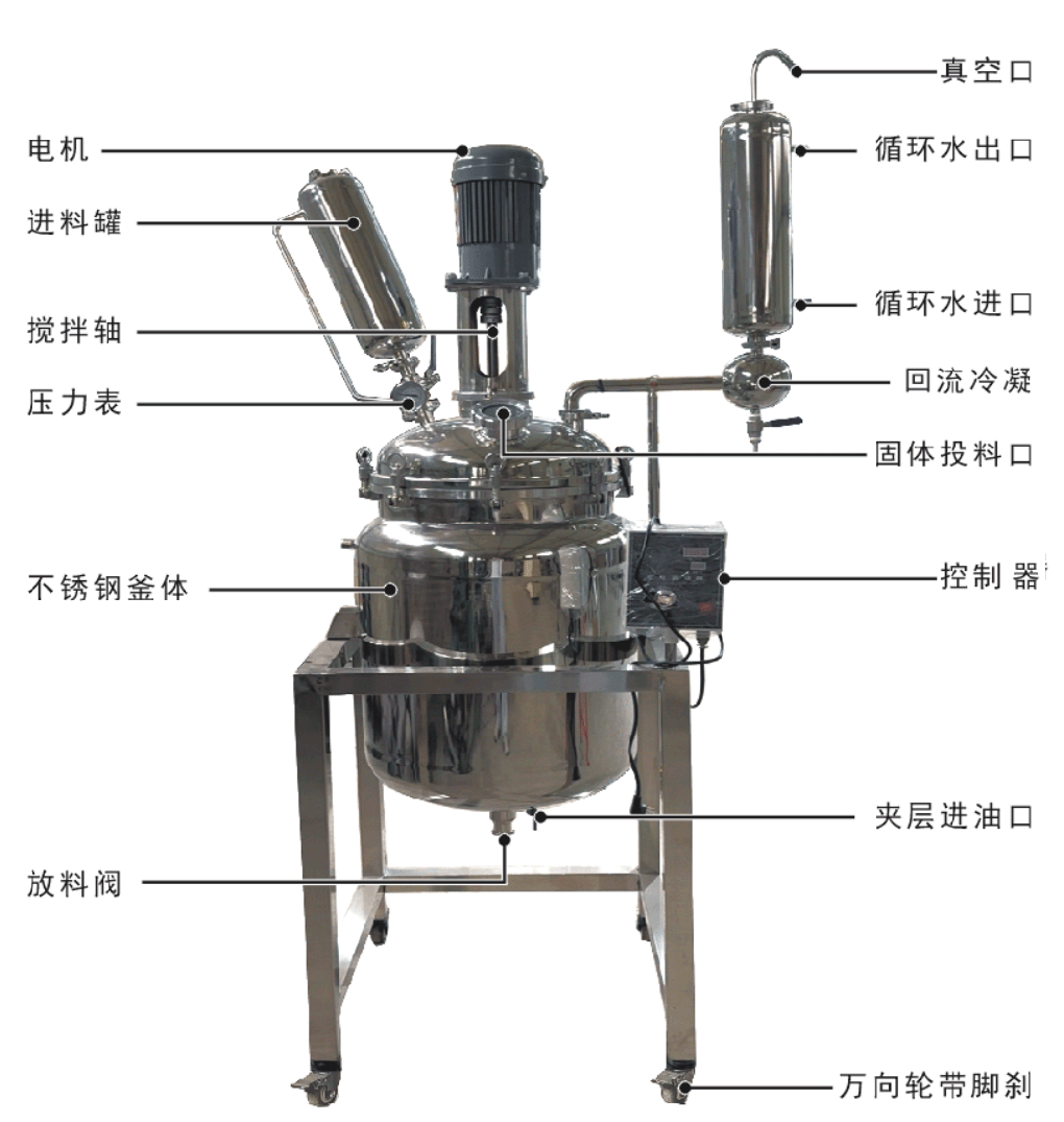 雙層不銹鋼反應釜為雙層不銹鋼設計,內層放入反應溶媒可做攪拌反應,夾層通上不同的冷熱源(冷凍液,熱水或熱油)做循環(huán)加熱或冷卻反應。在設定恒溫條件下